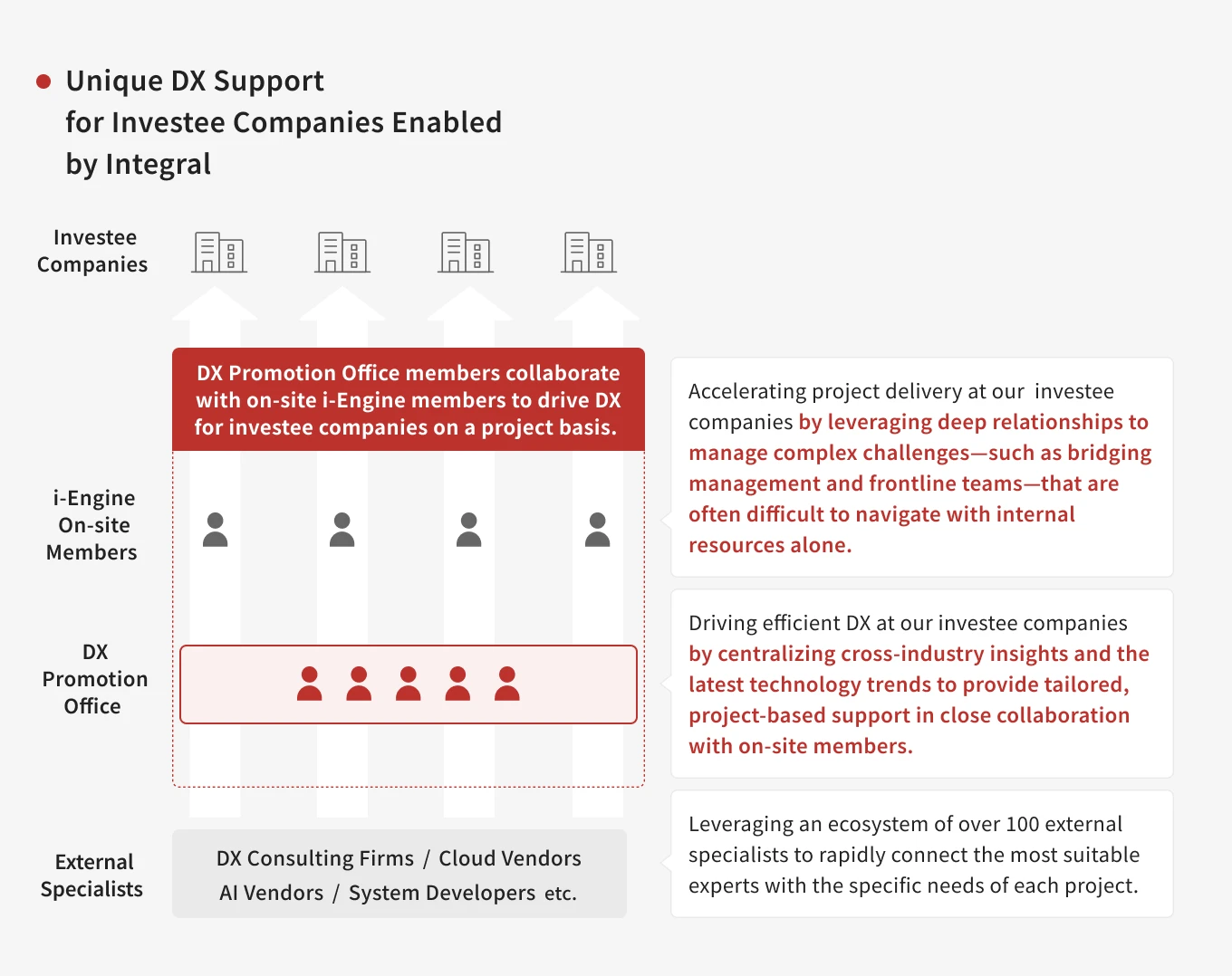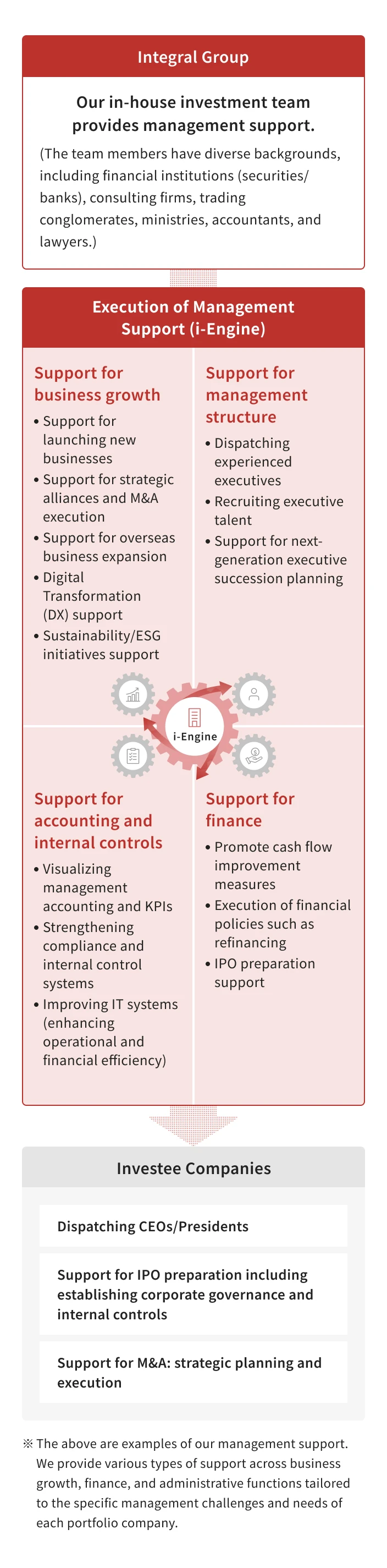 - To enhance the corporate value of our investee companies, we provide a program called "i-Engine." Depending on the company's needs, our in-house professionals work on-site, literally "sweating together" with the management team to execute various initiatives.