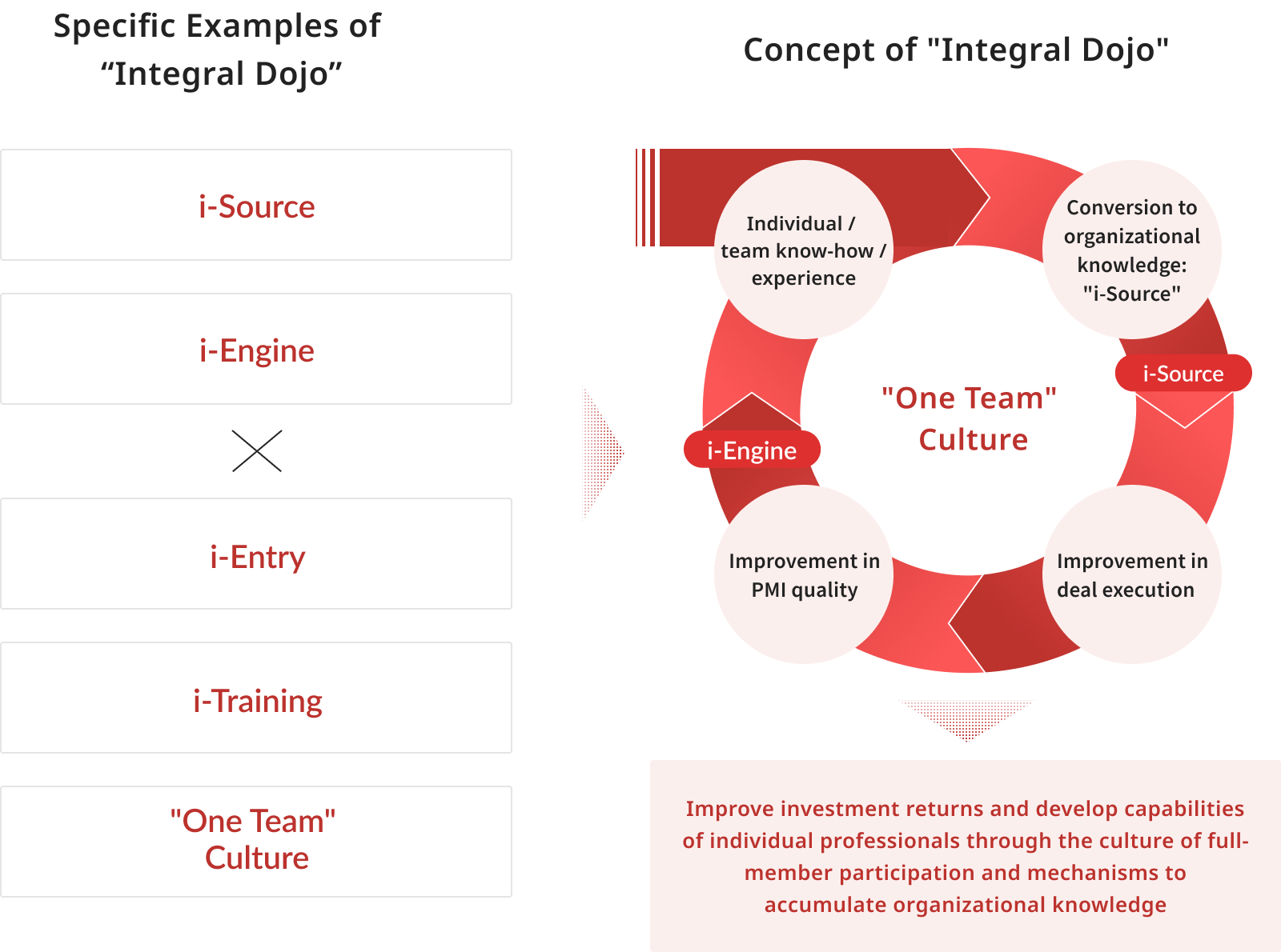 Through our unique talent development program called "Integral Dojo," we aim to nurture individuals who possess not only expertise and knowledge but also strong character and empathy. Furthermore, we strive to build a professional organization where such individuals unite to pursue both social value creation and investment returns.